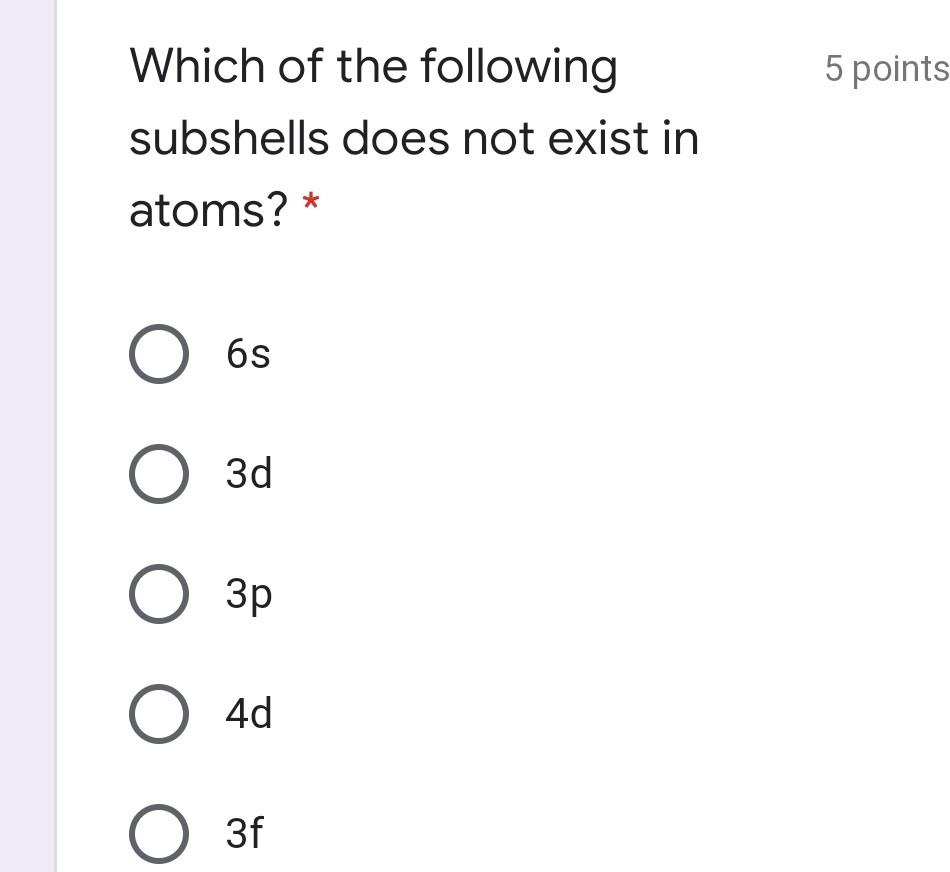 Solved 5 Points Which Of The Following Subshells Does Not Chegg Com